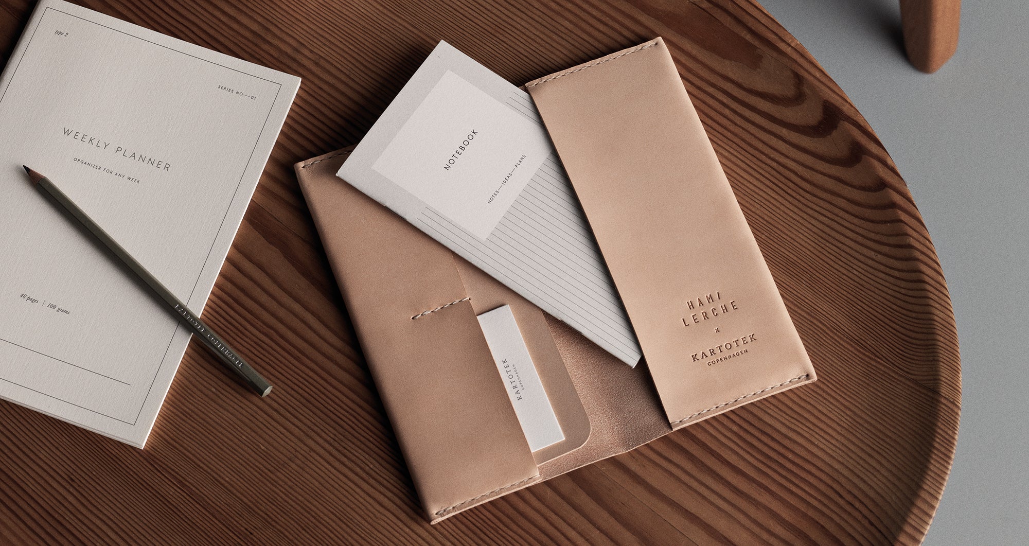 Samarbejdet mellem Kartotek Copenhagen og det danske designbrand Ham/Lerche, ligger et ligeså naturligt møde mellem to materialer, som klæder hinanden. Det er papiret med sin taktile overflade og stærke historie som medie til fordybelse og kreativitet – og læderet, der er det klassiske valg, når det gælder accessories, som er både smukke, praktiske og kan holde til hverdagens slid.
